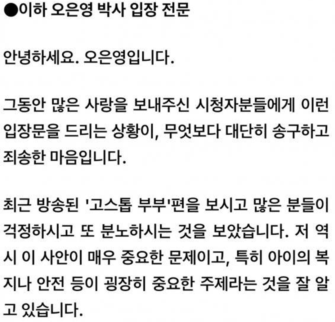 오은영 박사는 시청자들의 의견이 빗발치자 입장문을 발표했다. "그동안 많은 사랑을 보내주신 시청자분들에게 이런 입장문을 드리는 상황이, 무엇보다 대단히 송구하고 죄송한 마음입니다"라며 시작된다. "최근 방송된 "고스톱 부부"편을 보시고 많은 분들이 걱정하시고 또 분노하시는 것을 보았습니다. 저 역시 이 사안이 매우 중요한 문제이고, 특히 아이의 복지나 안전 등이 굉장히 중요한 주제라는 것을 잘 알고 있습니다." 라며 중요한 주제라며 말했다.