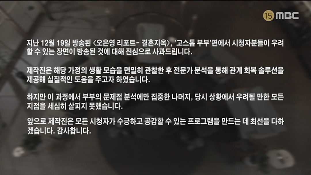 9일 오후 방송된 MBC 예능 프로그램 '오은영 리포트 결혼지옥' 에서는 제작진이 방송 시작과 동시에 사과문을 공개했습니다.