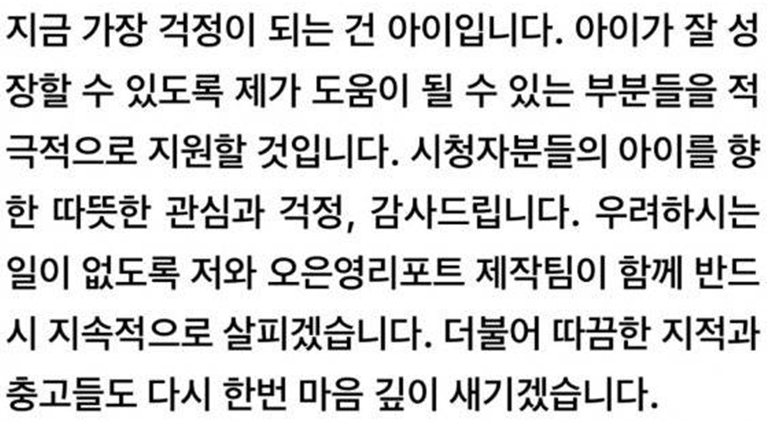 먼저 가장 걱정이 되는 건 성추행 논란의 피해자인 아이이며 아이가 잘 성장 할 수 있도록 오은영 박사가 도움이 될 수 있는 부분들을 적극 지원 할 것이라며 밝혔다.또한 대중들의 따끔한 지적과 충고들을 다시 한번 마음 속 깊이 새기고 제작진과 함께 아이를 지속적으로 살피겠다며 입장문을 마쳤다.